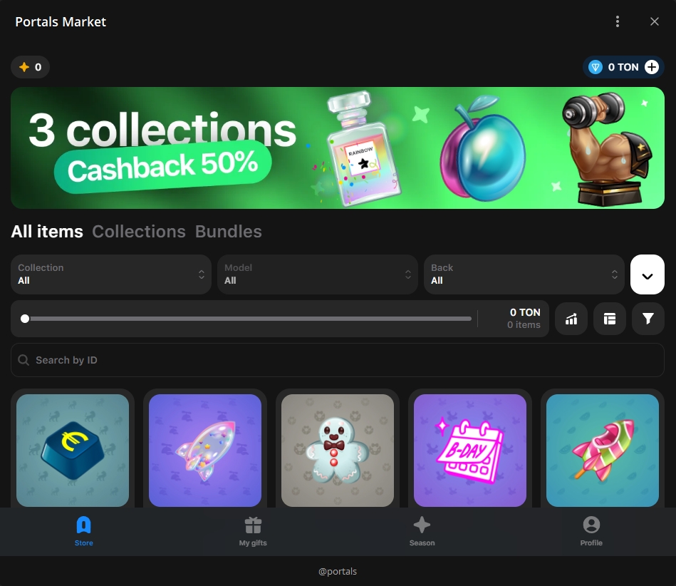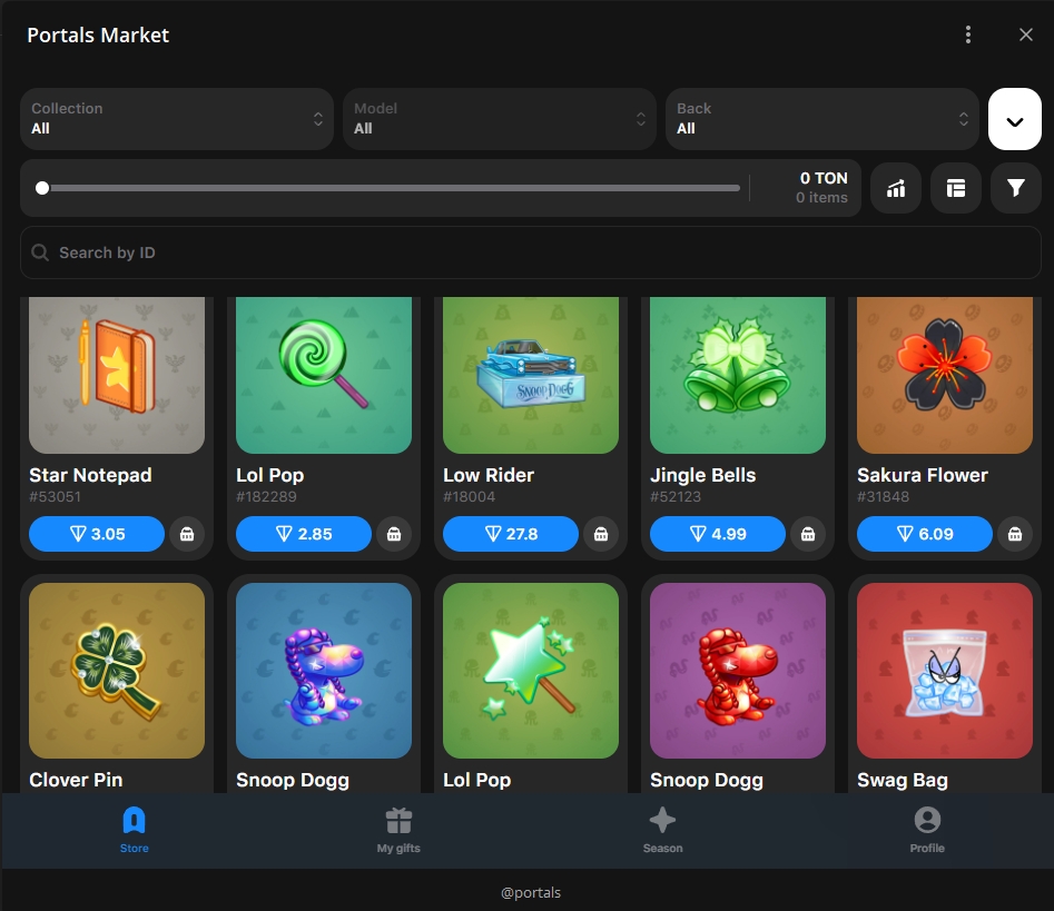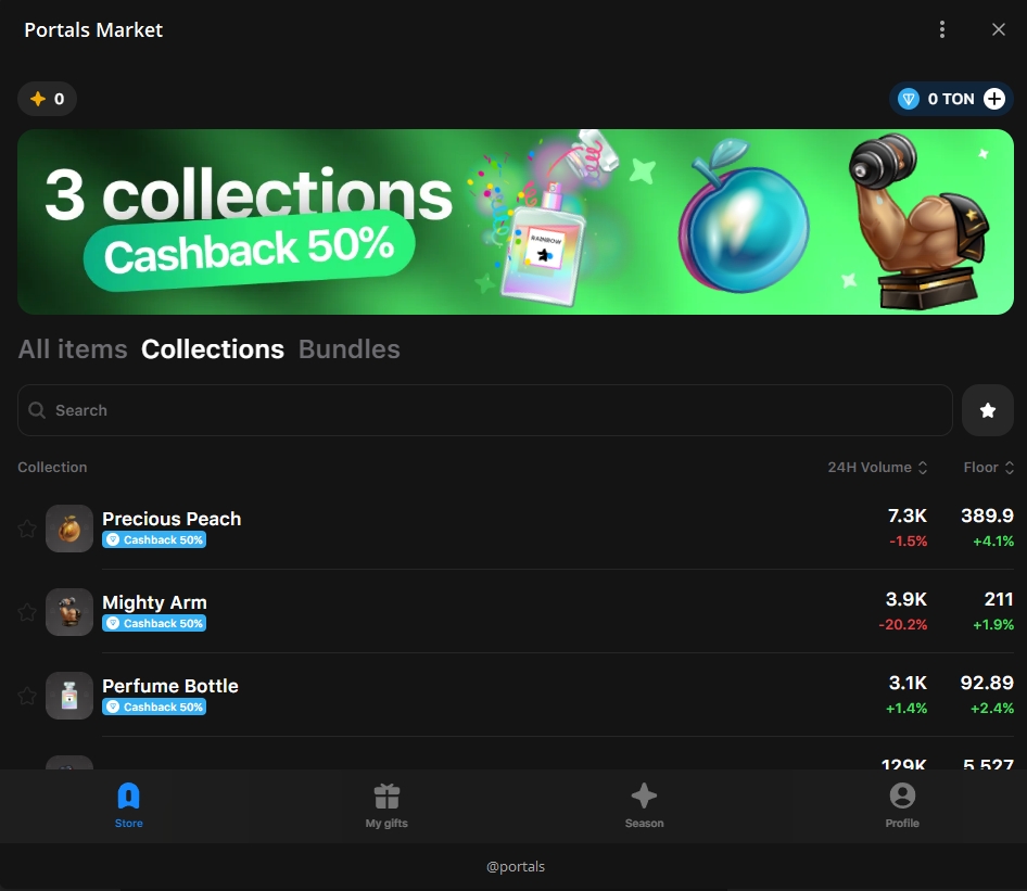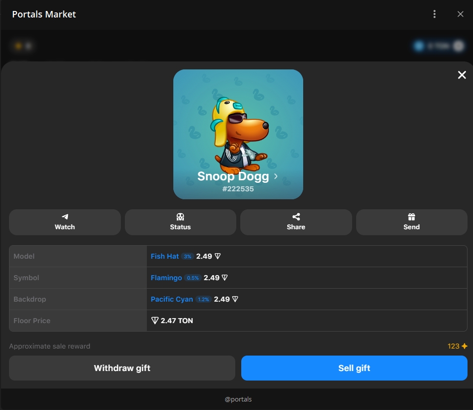Portals - это децентрализованный маркетплейс, работающий внутри мессенджера Telegram. Создателем маркета является Roxman - коллекционер и крупный холдер подарков Telegram. Его главная особенность в отличие от других маркетплейсов это самая низкая комиссия на рынке, а также самая большая ликвидность среди других маркетов.