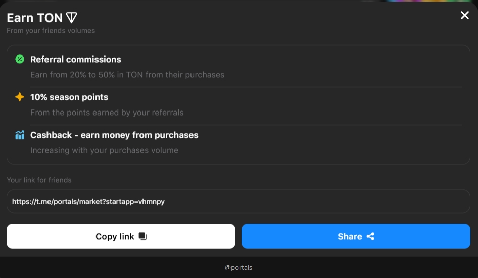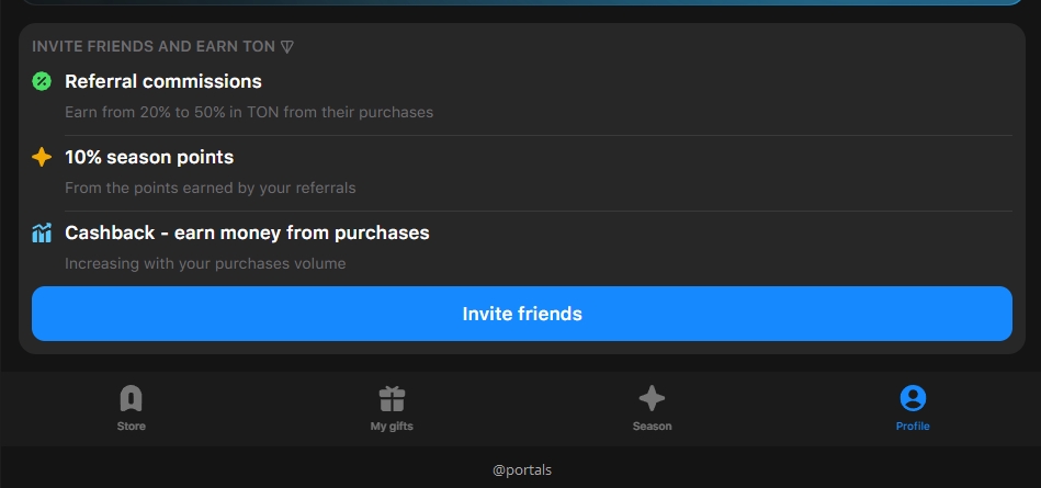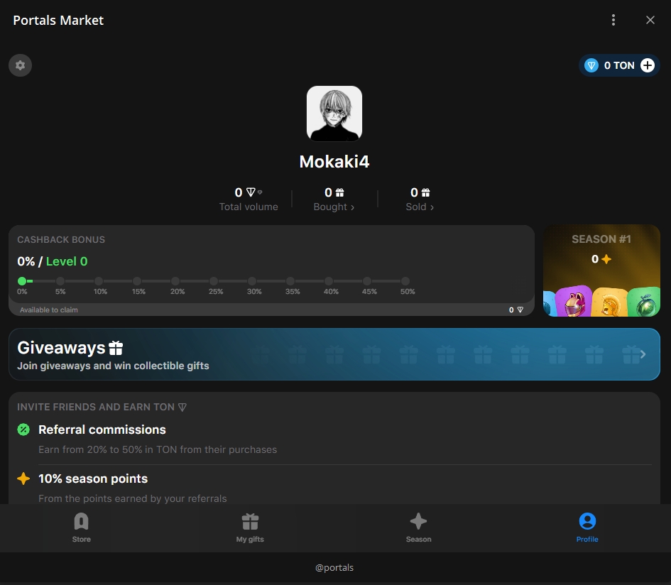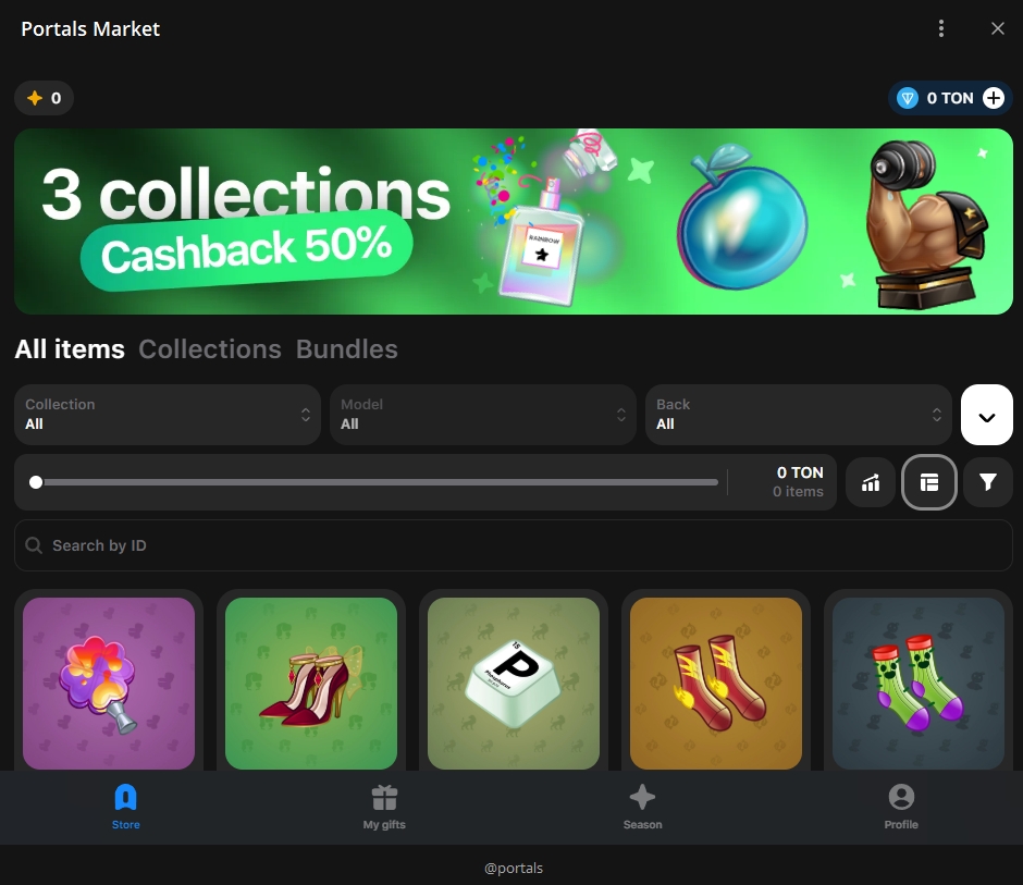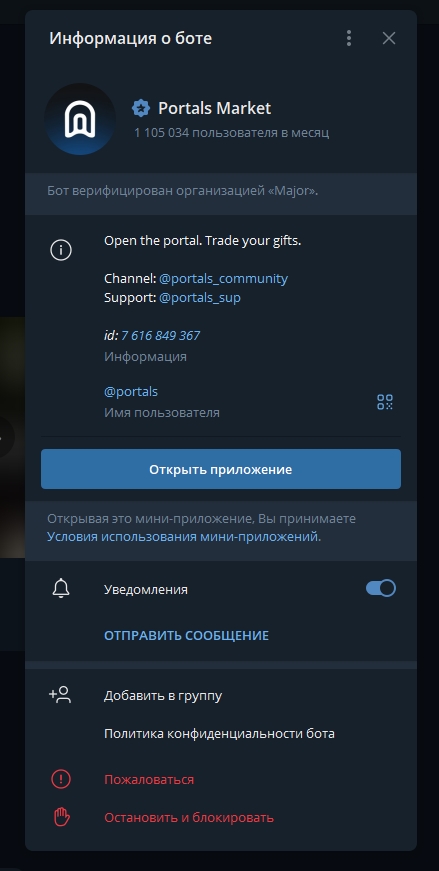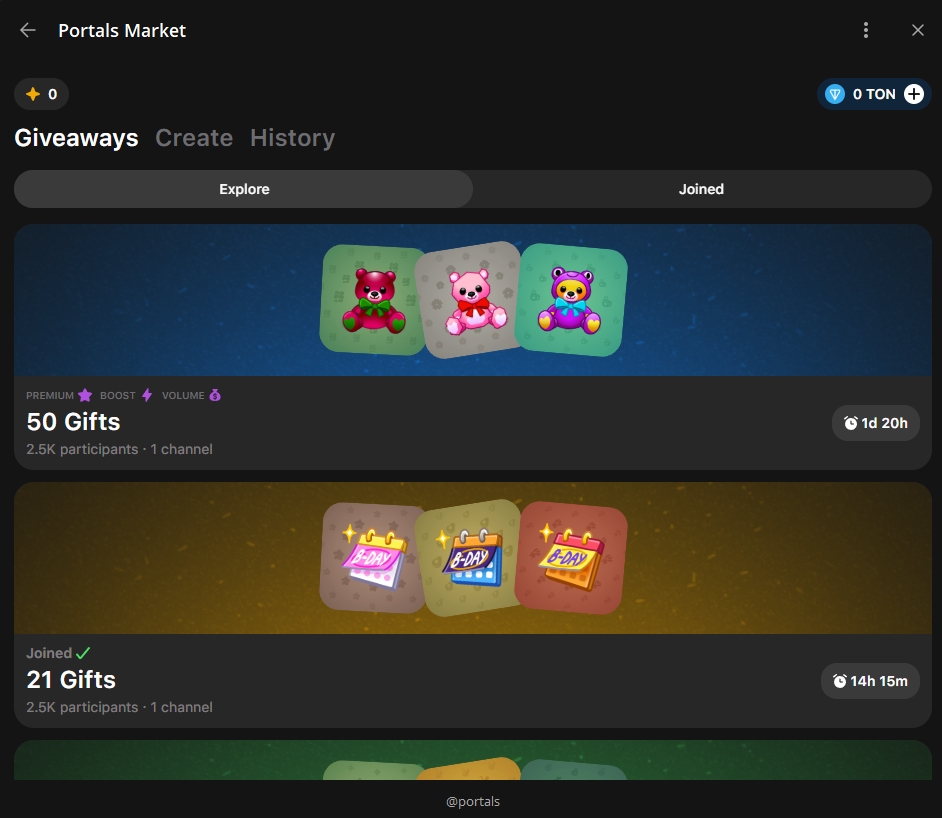 Portals - это децентрализованный маркетплейс, работающий внутри мессенджера Telegram. Создателем маркета является Roxman - коллекционер и крупный холдер подарков Telegram. Его главная особенность в отличие от других маркетплейсов это самая низкая комиссия на рынке, а также самая большая ликвидность среди других маркетов.