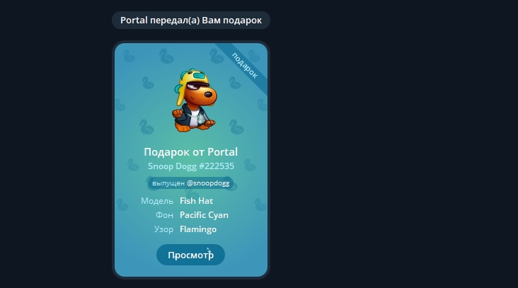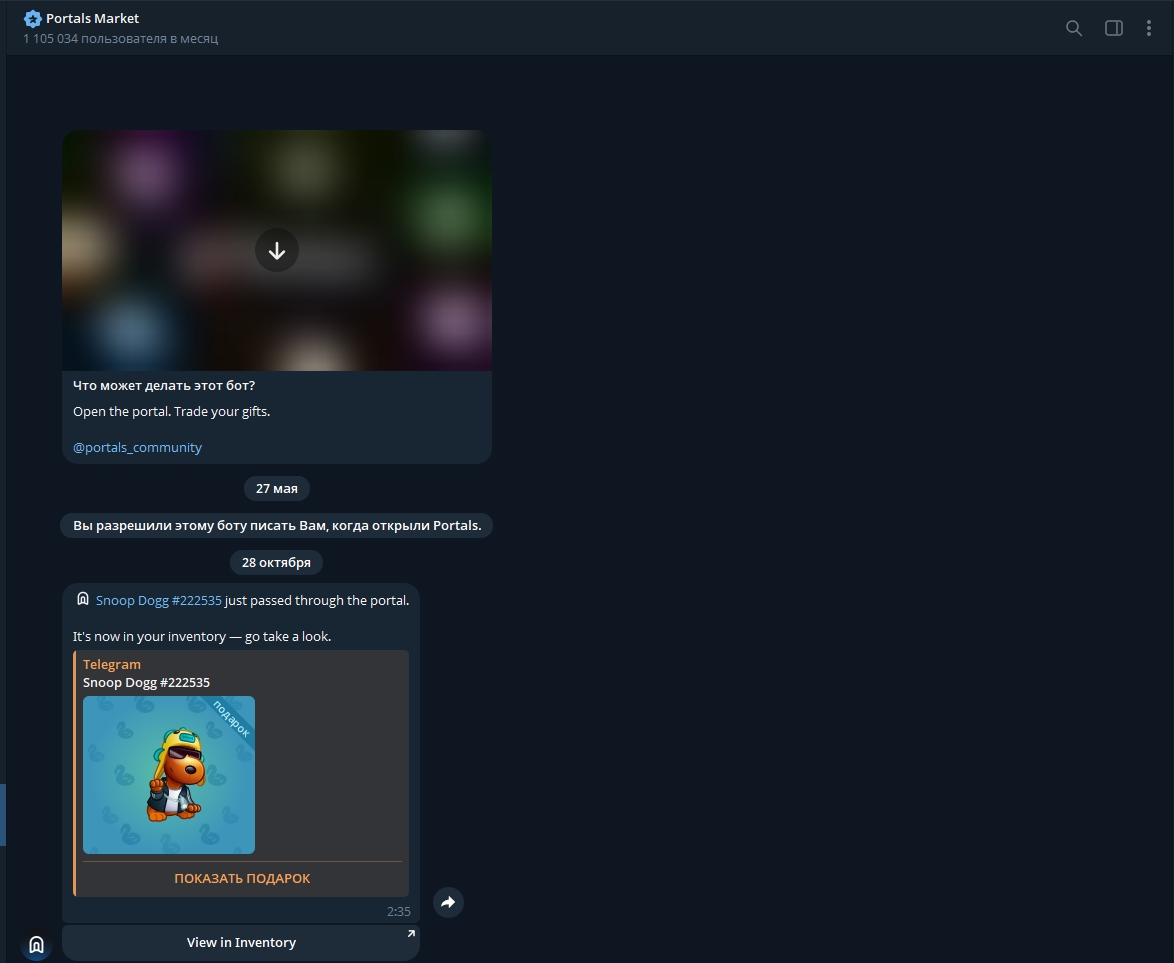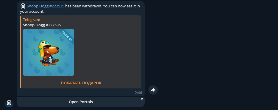 После отправки @portals пришлет уведомление о том, что подарок был зачислен к вам в My gifts - в инвентарь