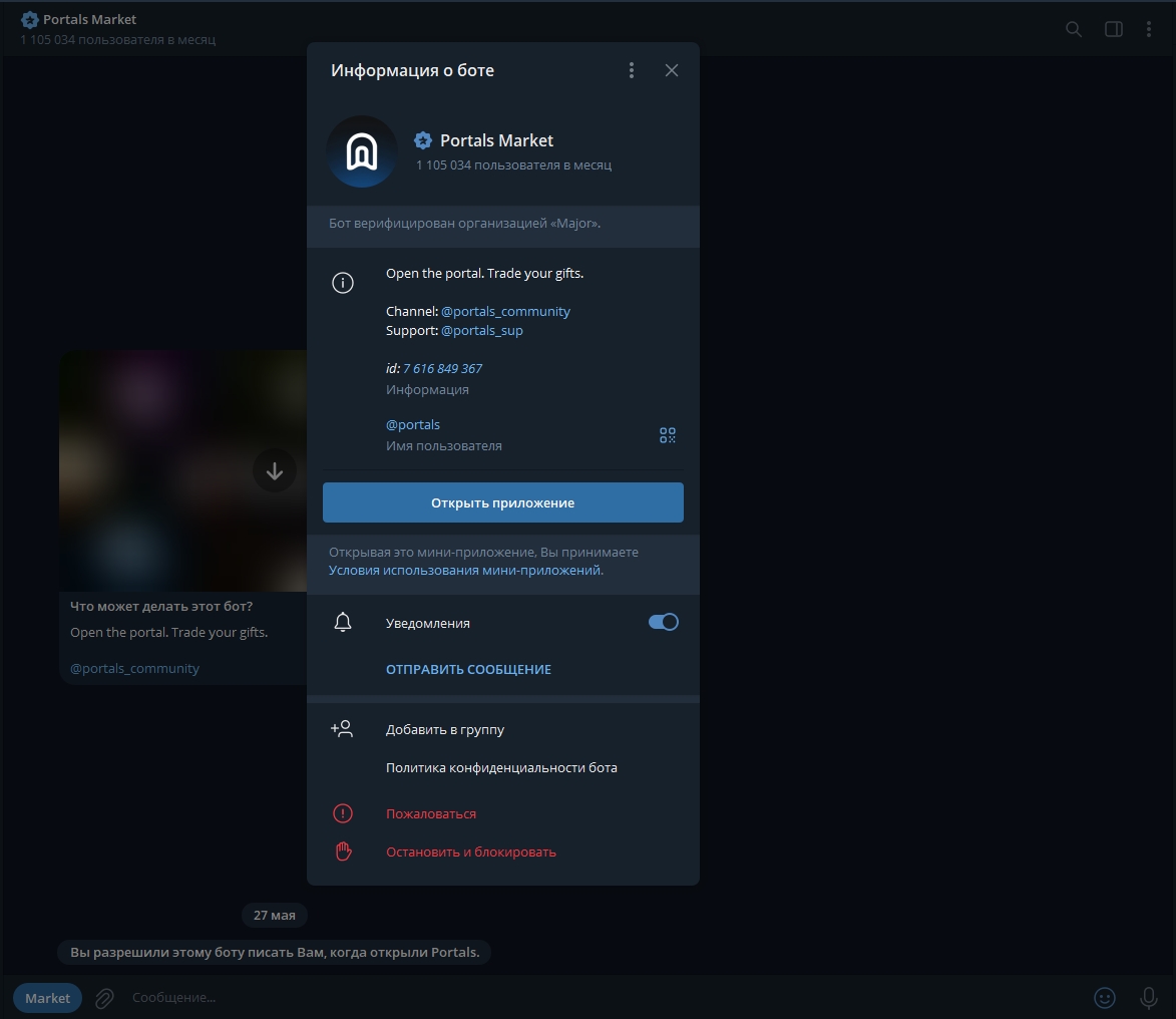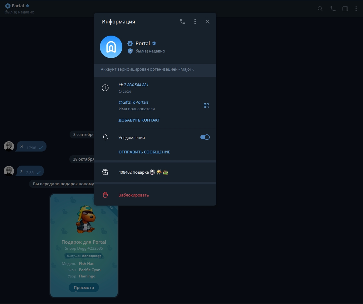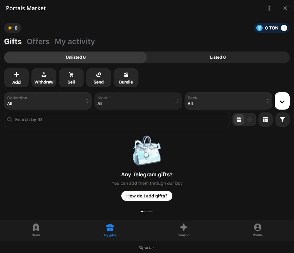 Закидываем наш подарок на Маркетплейс, для этого нам нужно перейти в @GiftsToPortals