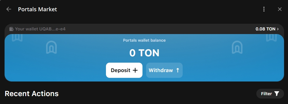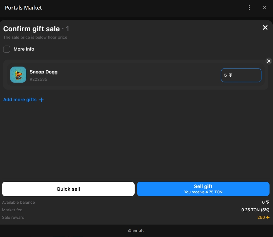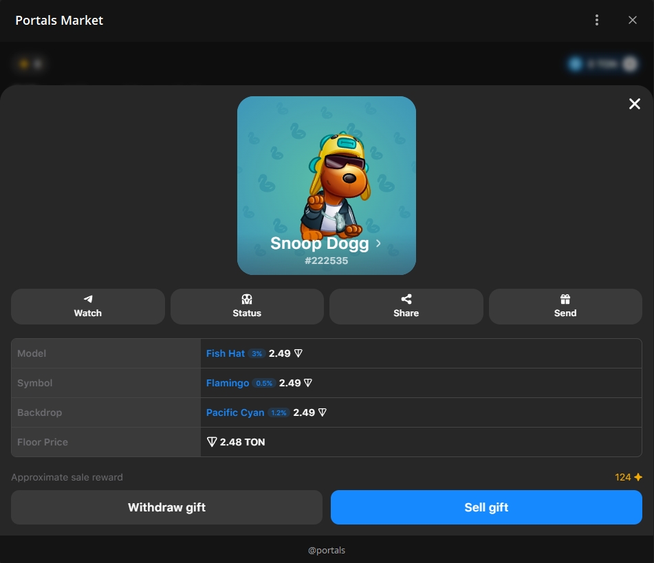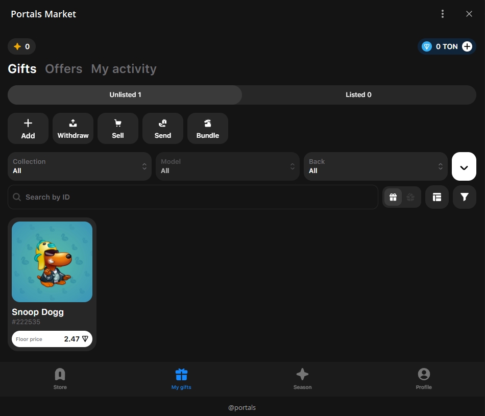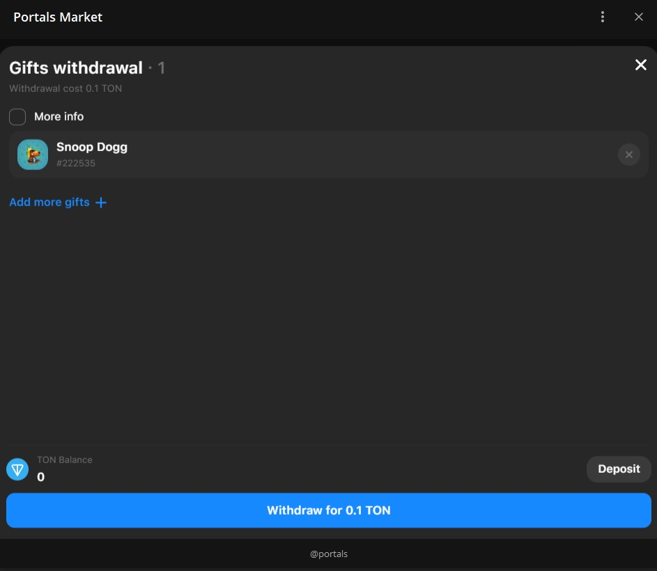 Для вывода у вас должно быть 0.1 Ton на Portals. Нажимаем на кнопку вывода и подарок возвращается к вам в Телеграм профиль: