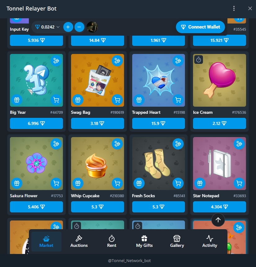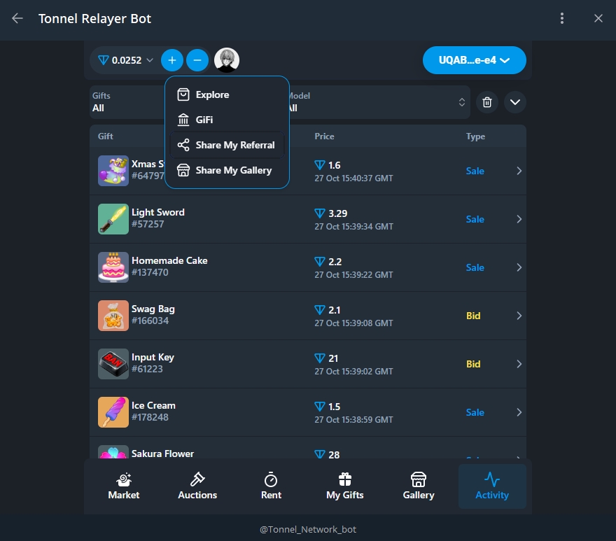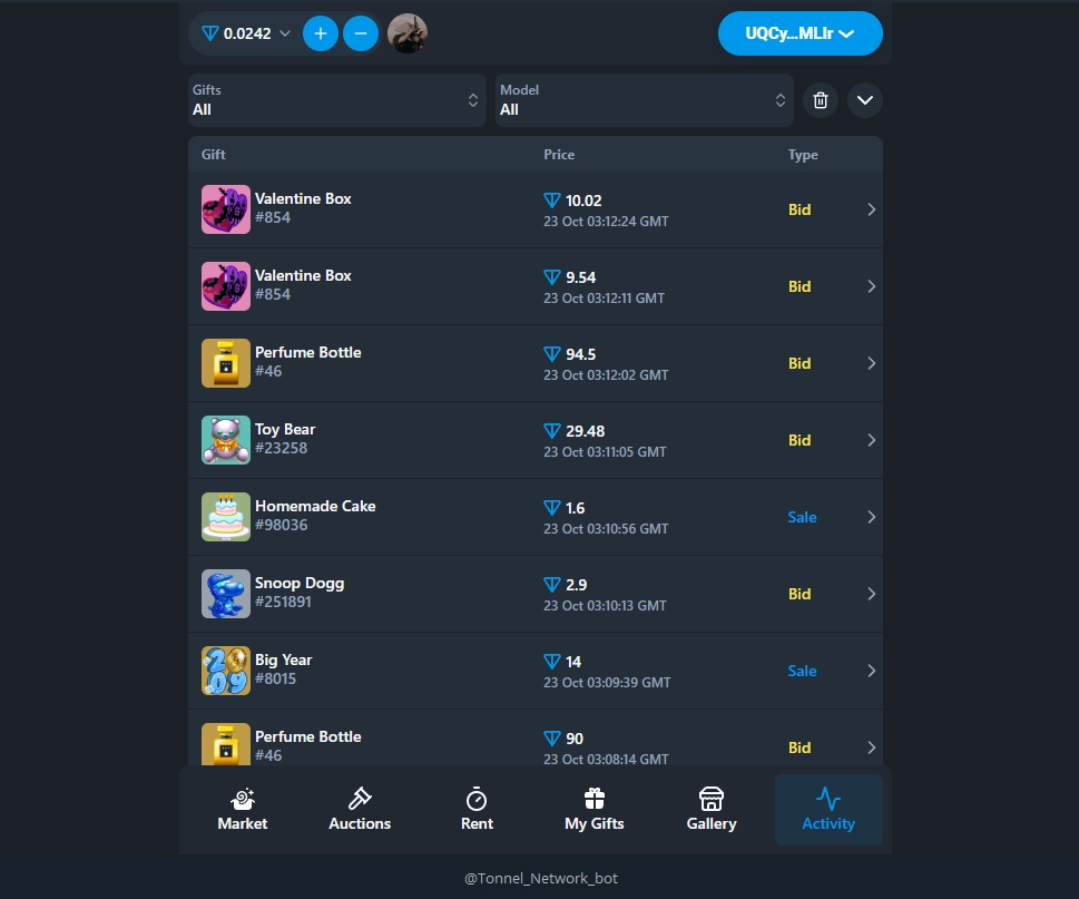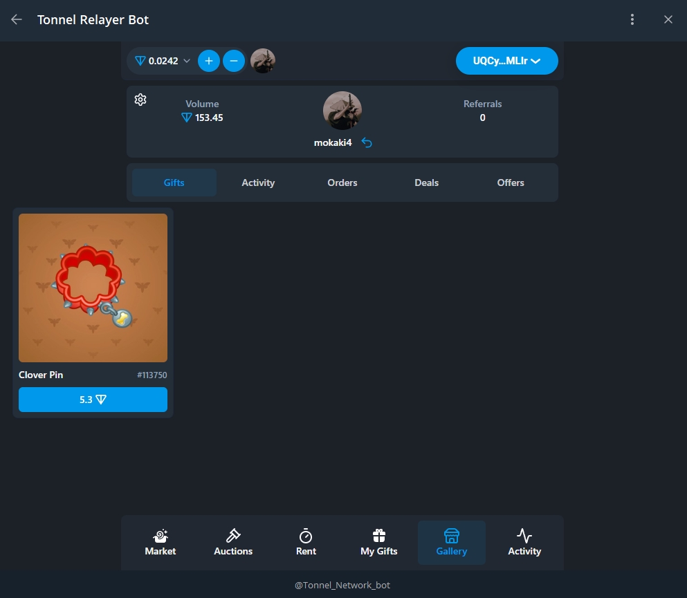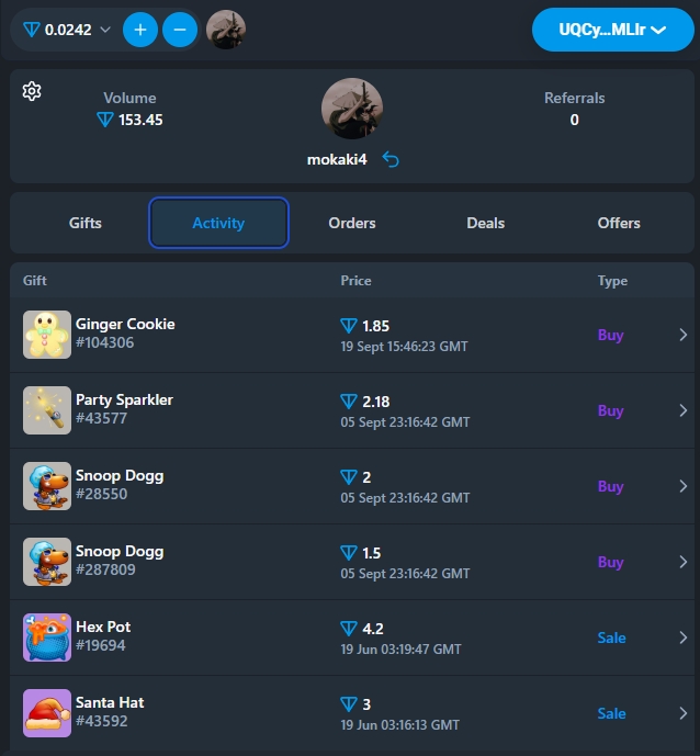 Здесь показывается весь актив маркетплейса - продажа/ставки подарков