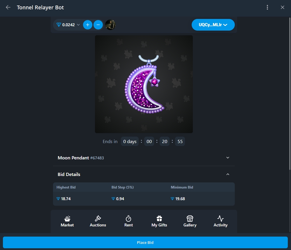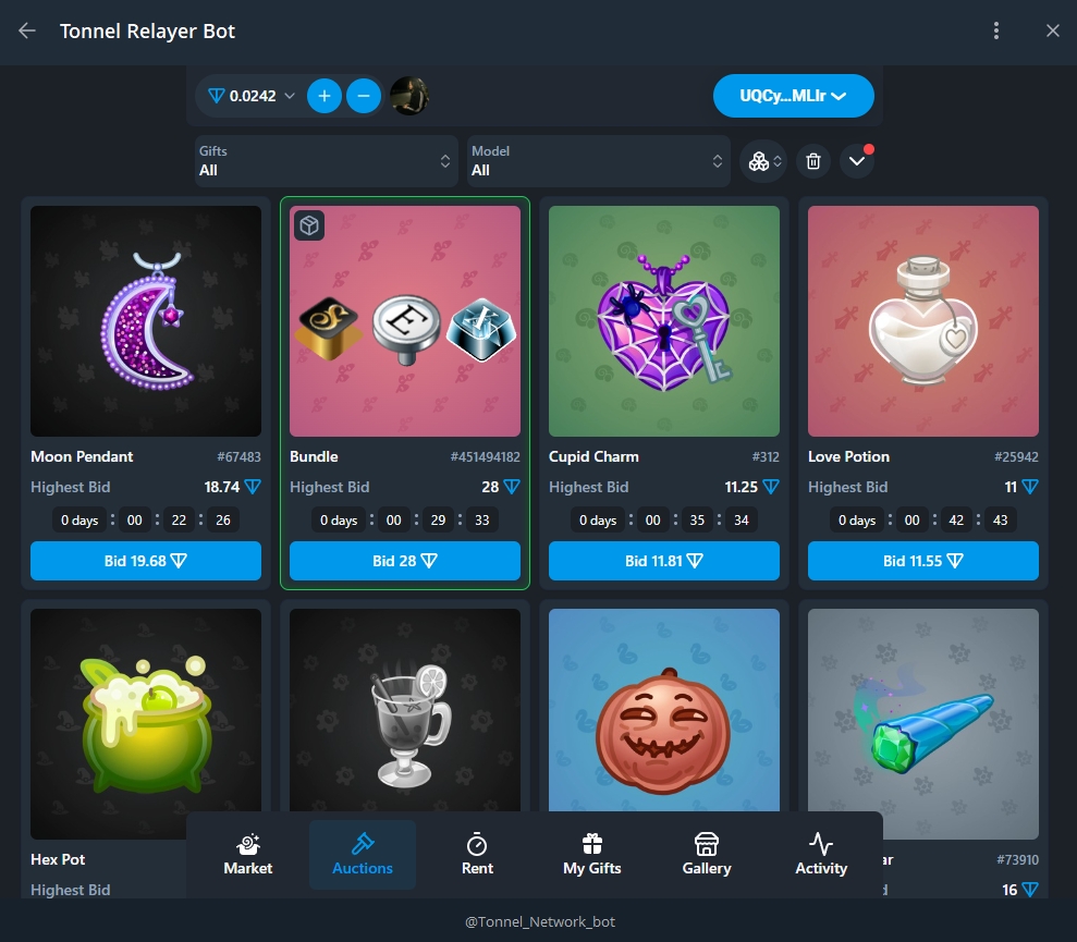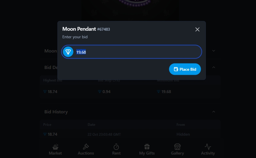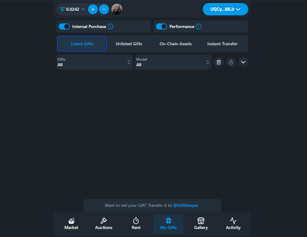 Здесь показывается весь актив маркетплейса - продажа/ставки подарков