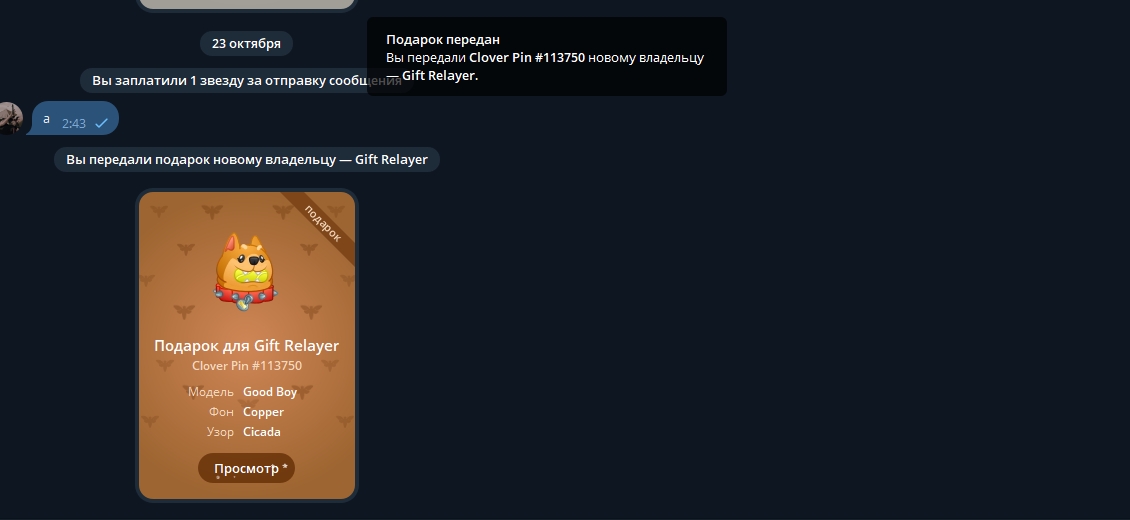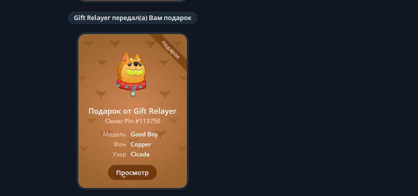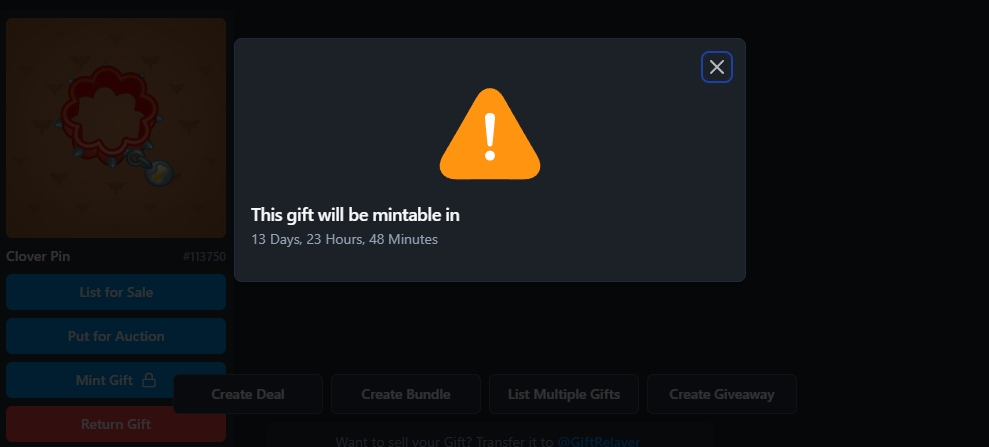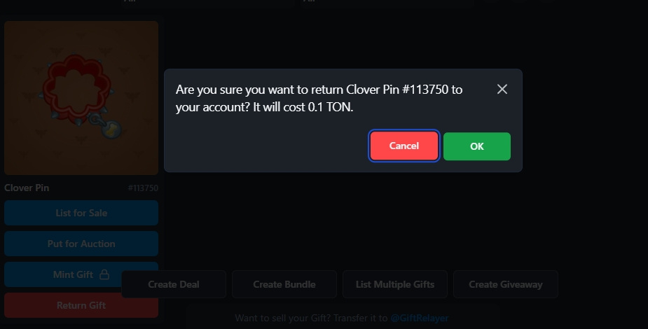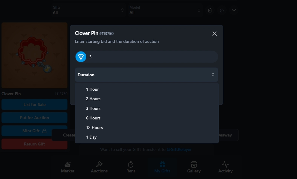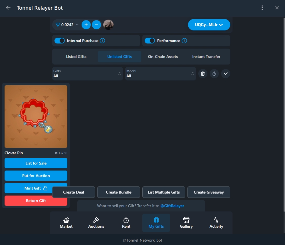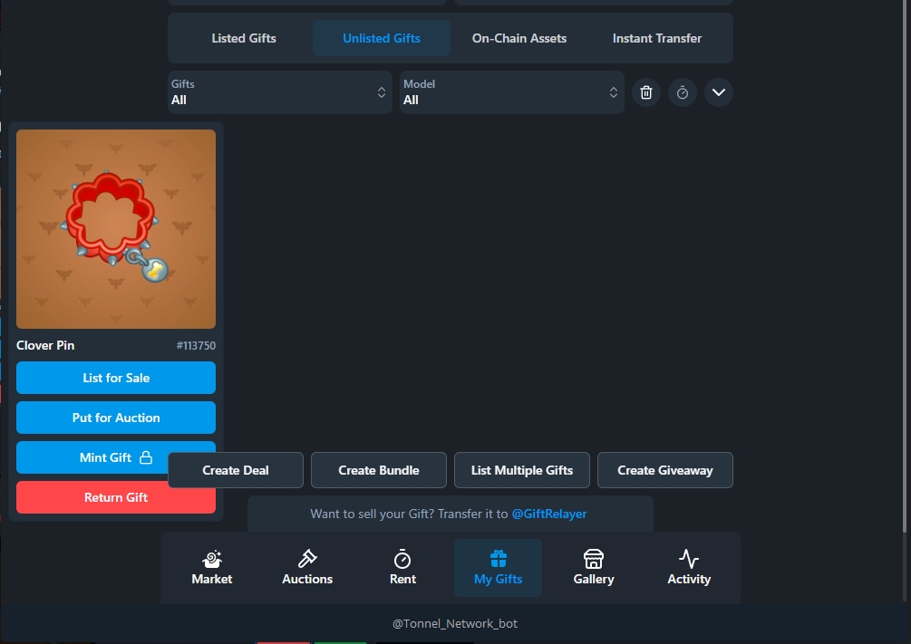 Закидываем наш подарок на Маркетплейс, для этого нам нужно перейти в @giftrelayer