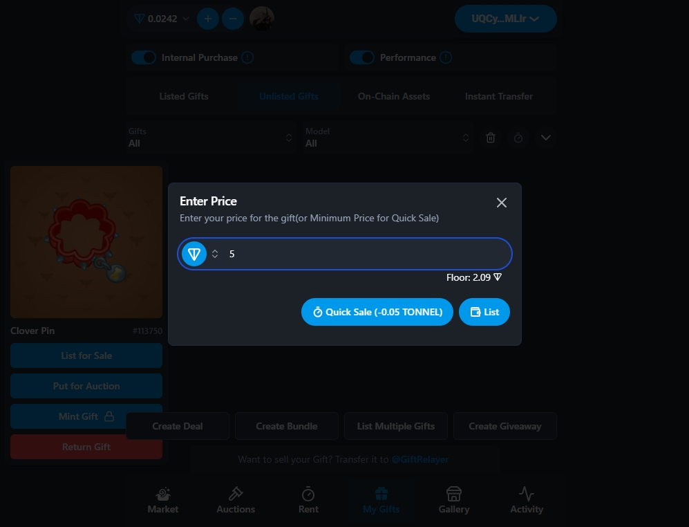 Выбираем за сколько мы хотим его продать и нажимаем на кнопку "List". Он появляется у нас в "Listed Gifts"