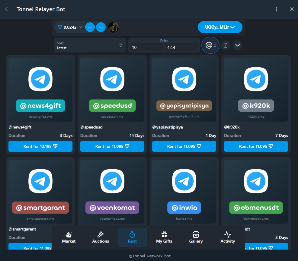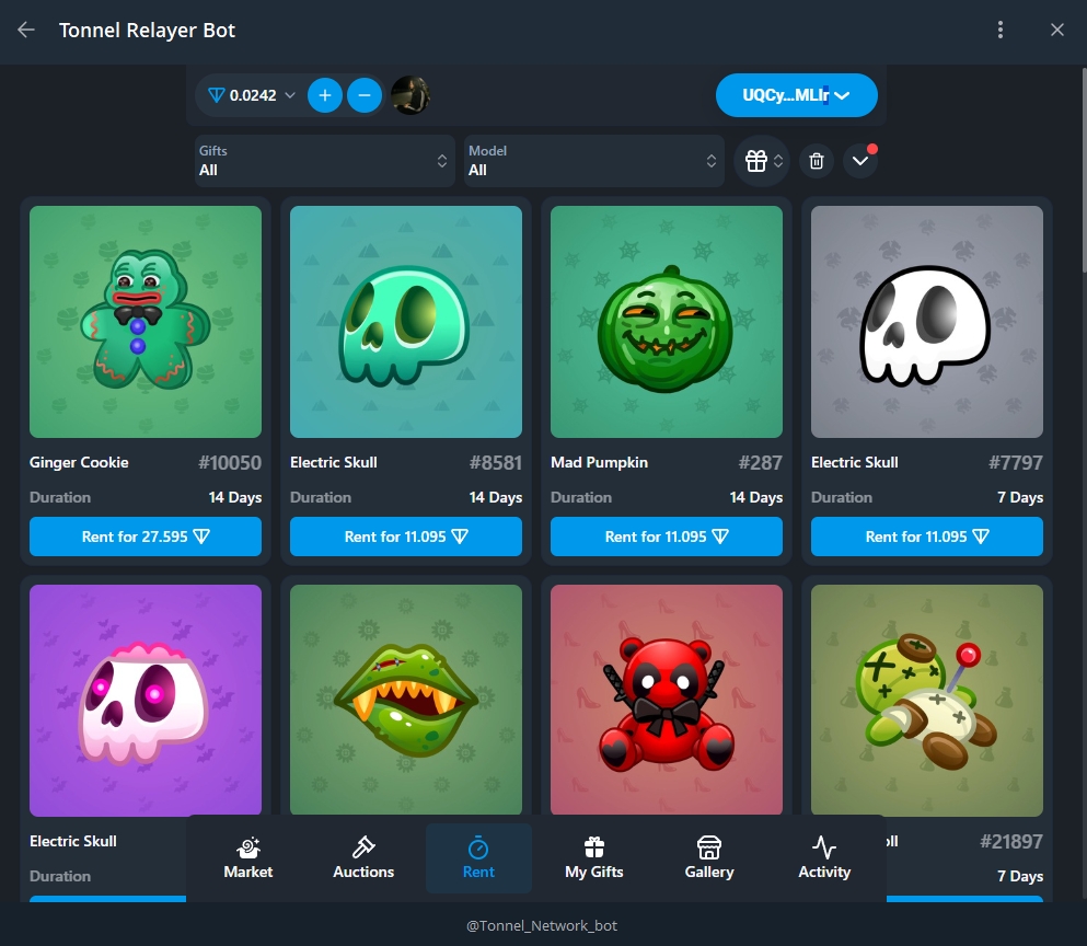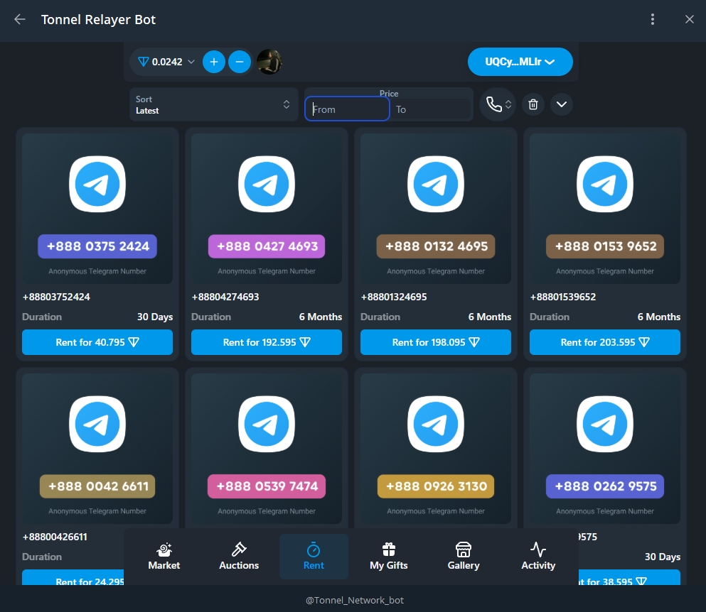 Здесь можно арендовать подарок на ваш профиль телеграмм на определенное время, обычно до месяца. А также Анонимные номера (До 6 месяцев) и Nft-юзернеймы (До 1 года)