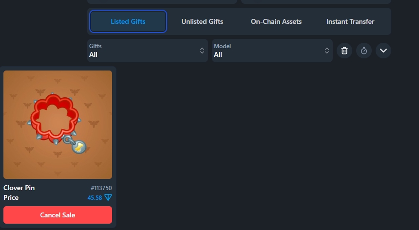 Чтобы вернуть подарок с выставления - заходим на вкладку "Listed Gifts"